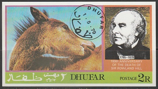 Дофар (Оман) 1979 год. 100 лет со дня смерти Роуленда Хилла. Лошади, гашёный блок (непочтовый)