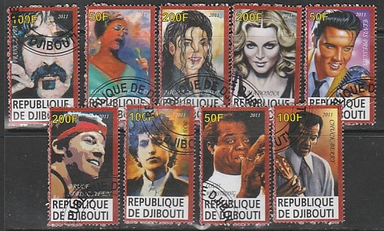 Джибути 2011 год. Знаменитые американские музыканты XX века, 9 марок (гашёные) Сувенирный выпуск.