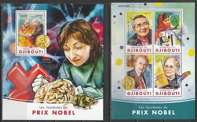Джибути 2016 год. Лауреаты Нобелевской премии, малый лист + блок.