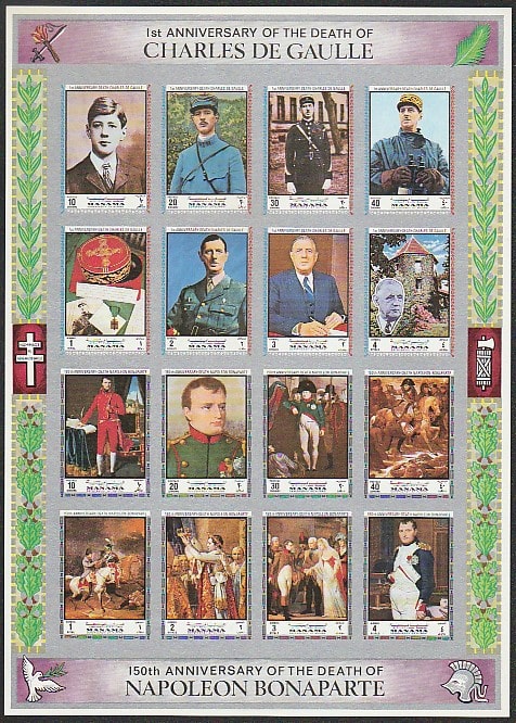 Эмират Аджман (Манама) 1972 год. Годовщины смерти: год Шарлю де Голлю, 150 лет Наполеону, б/зубц. лист. (32)