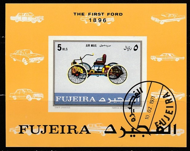 Эмират Фуджейра 1971 год. Первый автомобиль марки "Форд", блок (гашёный)