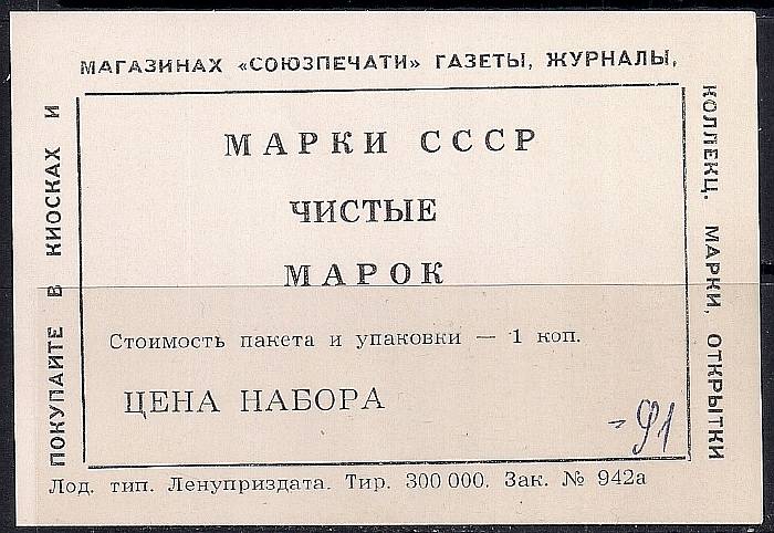 Этикетка к набору марок "Марки СССР чистые". (91 копейка