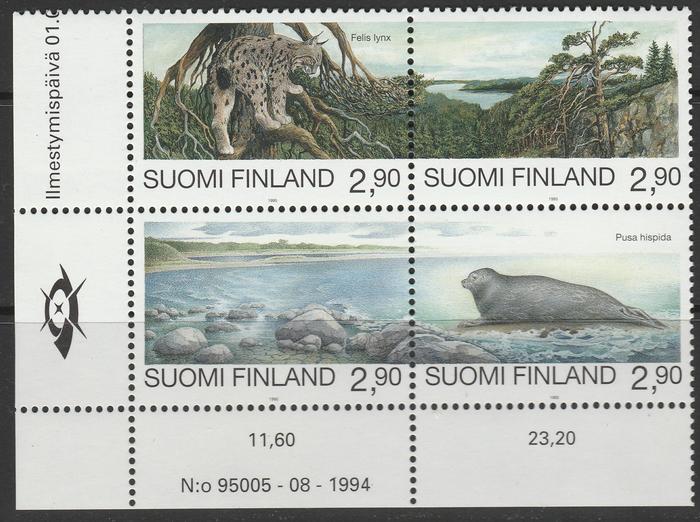 Финляндия 1995 год. Охрана природы: северная рысь, кольчатая нерпа. квартблок без полей