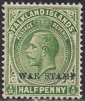 Фолклендские острова 1919 год. Король Георг 5-й. 1 марка из серии с надпечаткой