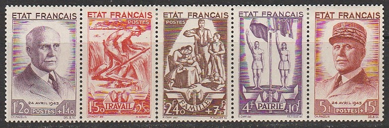 Франция 1943 год. Национальная Помощь. 87 лет со дня рождения маршала Петена, 5 марок в сцепке (наклейка)