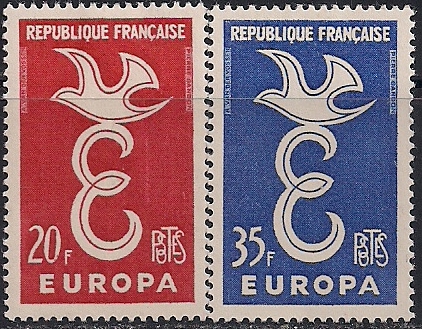 Франция 1958 год. Европа СЕПТ. Символический голубь над буквой "Е". 2 марки с наклейкой
