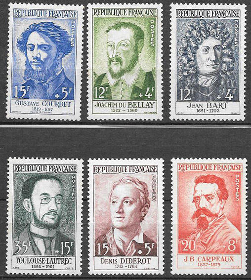 Франция 1958 год. Выдающиеся личности, 6 марок Курбе, Дидерот, Тулуз-Лотрек....