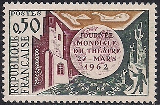Франция 1962 год. День театра. Сцена и глобус с надписью. 1 марка с наклейкой