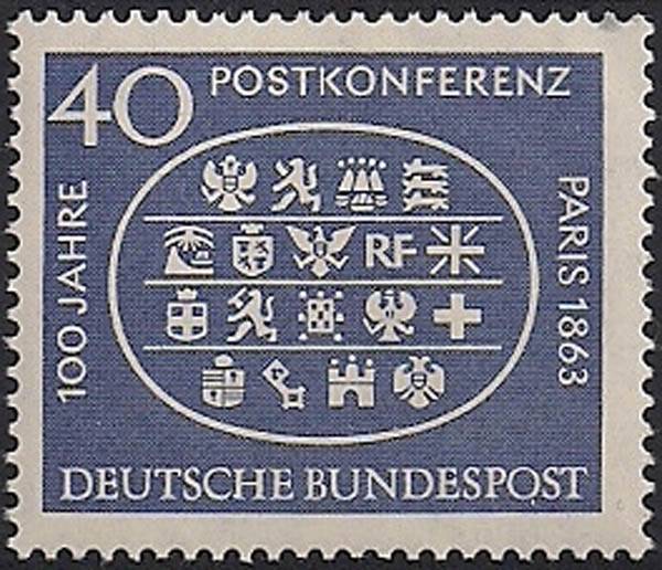 ФРГ 1963 год. 100 лет 1-й Международной Конференции почтовых работников в Париже. Гербы государств-участников. 1 марка