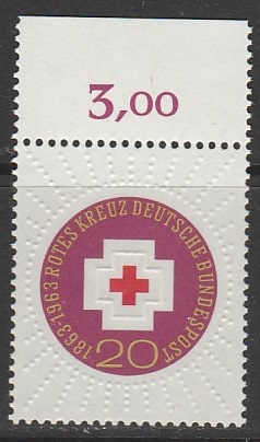 ФРГ 1963 год. 100 лет Международному Красному Кресту. Символическое изображение креста в лучах солнца, 1 марка с цифровым полем.