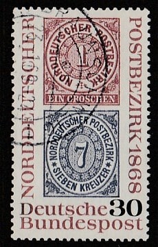 ФРГ 1968 год. 100 лет основанию почтового сообщения в Северной Германии. Марки северо-германской почты, 1 марка (гашёная)