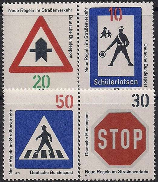 ФРГ 1971 год. Новые правила дорожного движения. Дорожные знаки. 4 марки