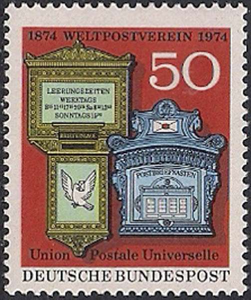 ФРГ 1974 год. 100 лет Всемирному Почтовому договору. Почтовые вывески Швейцарии и Германии. 1 марка