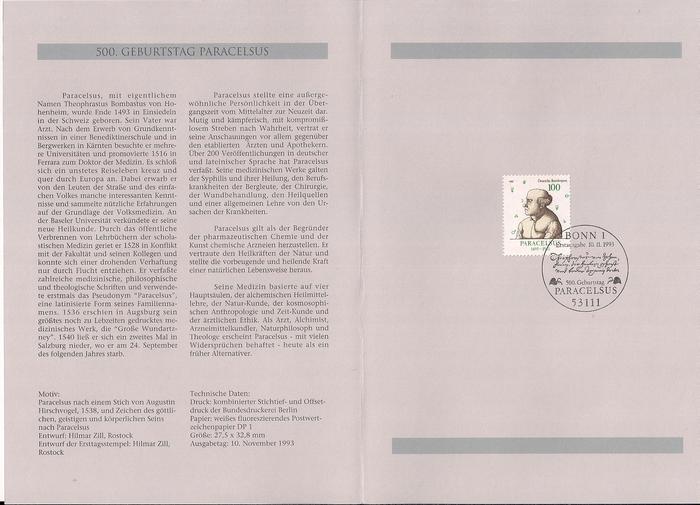 ФРГ 1993 год. 500 лет со дня рождения врача Парацельса. Марка на листе с гашением первого дня