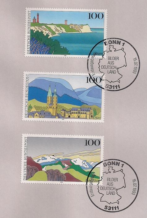 ФРГ 1993 год. Виды Германии. 3 марки на листе с гашением первого дня