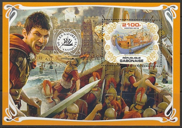 Габон 2019 год. Корабли древности. Галера, блок. Сувенирный выпуск.