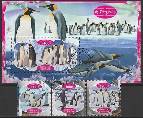 Габон 2020 год. Пингвины, 3 марки + блок (гашёные) Сувенирный выпуск.