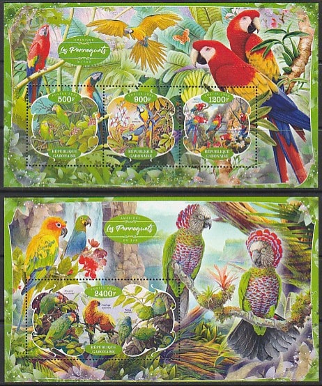 Габон 2020 год. Попугаи, малый лист + блок (II)