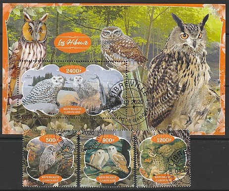 Габон 2020 год. Совы, 3 марки + блок (гашёные) Сувенирный выпуск.
