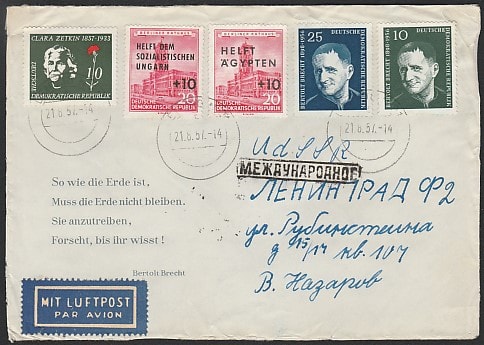ГДР 1957 год. 1 год со дня смерти драматурга Бертольда Брехта, 5 гашёных марок (на листе конверта)