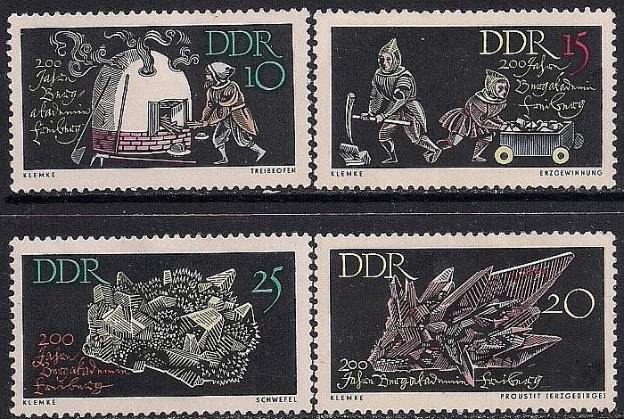 ГДР 1965 год. 200 лет Горной Академии. 4 марки с наклейкой