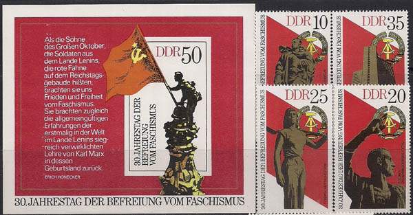 ГДР 1975 год. 30 лет победы над фашизмом. Памятники в Берлине и Москве. 1 блок + 4 марки