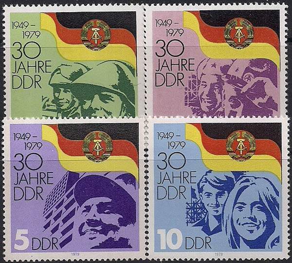 ГДР 1979 год. 30 лет ГДР. Плакаты с изображением молодёжи, рабочих, солдат под флагом ГДР. 4 марки