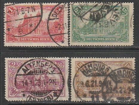 Германия 1920 год. Стандарт. Рейхспочта. Почтамт, 4 гашеные марки (разные гашения)