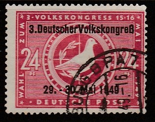 Германия 1949 год (советская зона оккупации). Заседание III Народного конгресса, 1 марка с надпечаткой (гашёная)