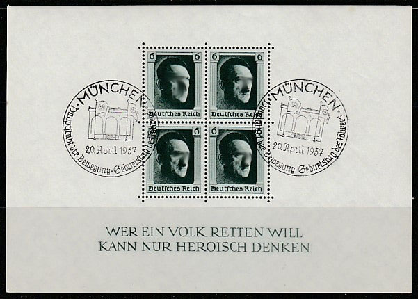 Германия (III Рейх) 1937 год. 48 лет со дня рождения рейхсканцлера Адольфа Гитлера, блок (гашёный)
