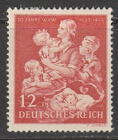 Германия (III Рейх) 1943 год. 10 лет работы зимней помощи. Мать с детьми, 1 марка (наклейка)