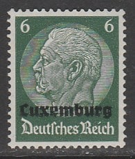 Германия (III Рейх. Оккупация Люксембурга) 1940 год. Стандарт. Рейхспрезидент Пауль фон Гинденбург, (ном. 6 Pf), НДП, 1 марка из серии.