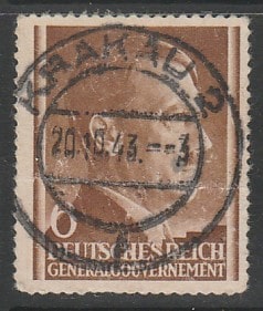 Германия (III Рейх, оккупация Польши) 1941 год. Стандарт. Рейхсканцлер А. Гитлер, ном. 6 Gr, 1 марка из серии (гашёная) (1 из 12)