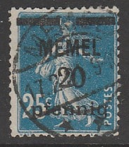 Германия (Мемель) 1920 год. Стандарт. НДП чёрного цвета типографии Парижа, 20 Pf/25 С, 1 марка из серии (гашёная)