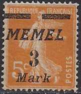 Германия Рейх (Мемель) 1922 год. НДП нового номинала (3 марки) на марке с номиналом 5 сантимов. 1 марка из серии