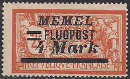 Германия Рейх (Мемель) 1922 год. НДП нового номинала (4 марки) на марке с номиналом 2 франка. 1 марка с наклейкой из серии