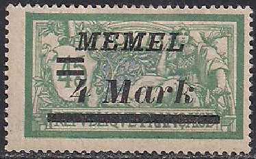 Германия Рейх (Мемель) 1922 год. НДП нового номинала (4 марки) на марке с номиналом 45 сантимов. 1 марка с наклейкой из серии