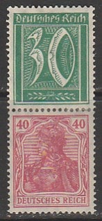 Германия (Веймарская республика) 1920/1921 год. Стандарт. Цифровой номинал в квадрате. Аллегорический образ Германии, 30/40 Pf., пара марок (наклейка)