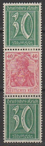 Германия (Веймарская республика) 1920/1921 год. Стандарт. Цифровой номинал в квадрате. Аллегорический образ Германии, 30/40/30 Pf., сцепка 3 марок (наклейка) (16/9,5/500)