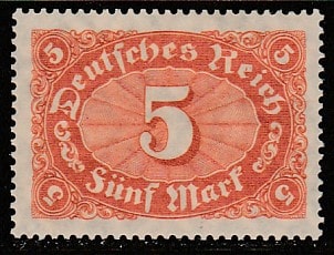 Германия (Веймарская республика) 1921 год. Стандарт. Номинал в овале, 5 М., 1 марка из серии (наклейка) (1 из 19)