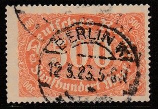 Германия (Веймарская республика) 1922 год. Цифровой рисунок в овале, номинал 500 М., 1 марка из серии (гашёная)