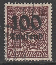 Германия (Веймарская республика) 1923 год. Цифровой рисунок, надпечатка нового номинала, 100 Tsd M /15 Pf, 1 служебная марка из серии (гашёная)