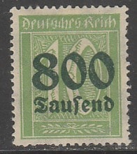 Германия (Веймарская республика) 1923 год. Стандарт. Цифровой рисунок в квадрате. Надпечатка нового номинала, 800Tsd/10Pf., 1 марка из серии (наклейка) (1 из 14)
