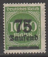 Германия (Веймарская республика) 1923 год. Стандарт. Надпечатка нового номинала, 75Tsd/1000М, 1 марка из серии (наклейка) (1 из 20)