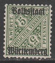 Германия (Вюртемберг) 1919 год. Номинал на щите, надпечатка, ном. 5 Pf, 1 служебная марка из серии (наклейка)(1 из 13)