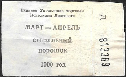 Главное управления торговли Исполкома Ленсовета, талоны на стиральный порошок. Март-Апрель 1990 г. Разные серии