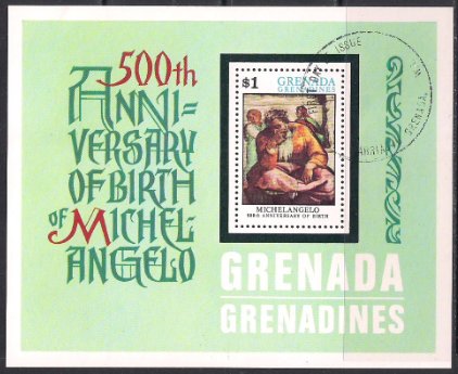 Гренада 1975 год. 500 лет со дня рождения Микеланджело. Гашеный блок