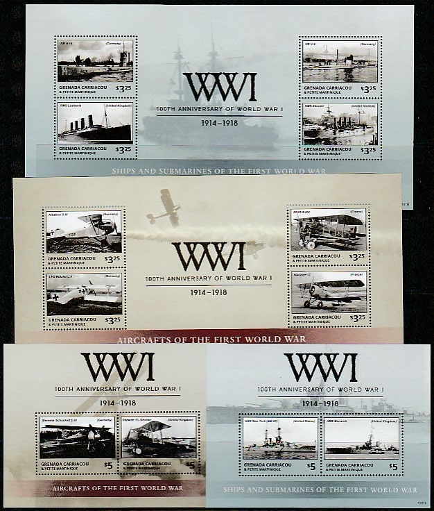 Гренада (Карриаку и Малый Мартиник) 2014 год. 100 лет началу I Мировой войны. Авиация и флот, 2 малых листа + 2 блока (н)