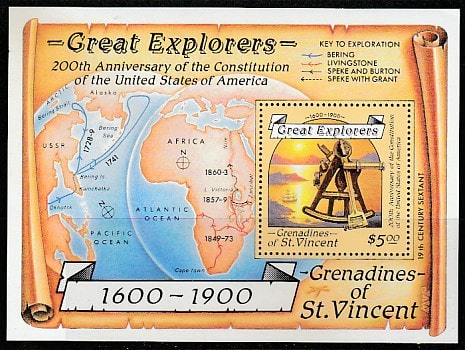 Гренадины и Сент-Винсент 1988 год. 200 лет Конституции США. Великие исследователи. Секстант, блок. (3)