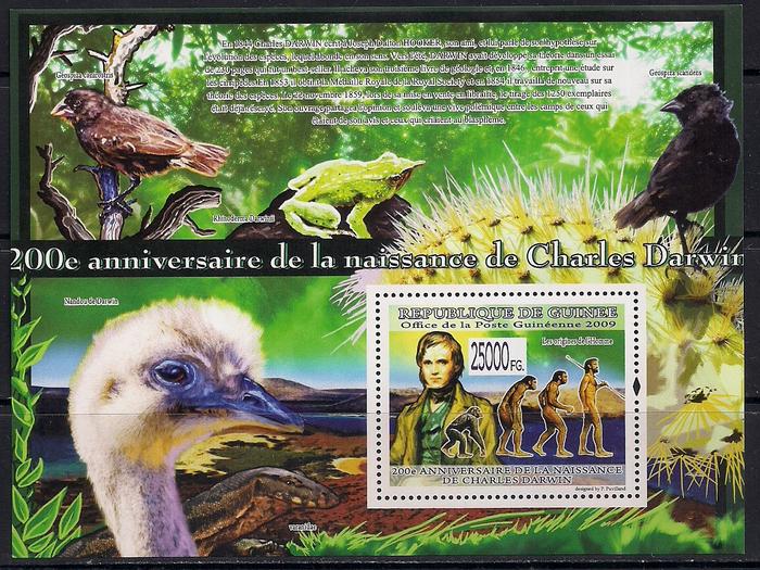 Гвинея 2009 год. 200 лет со дня рождения биолога Ч. Дарвина. Птицы, лягушка. Блок